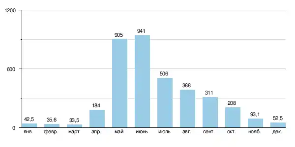 Среднемноголетний расход воды − 381 м³/с, в районе Абазы — 308 м³/с.
