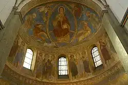 Особо ценная фреска находится во внутренней купольной части западной апсиды. Она изображает восседающего Спаса Вседержителя (Иисус Панкратор), окружённого символами апостолов-евангелистов с предстоящими по сторонам первоверховными апостолами Петром и Павлом. Чуть ниже по периметру изображены остальные апостолы из 12-ти. Центральная фреска Иисуса Паркратора является типичной для византийского церковного искусства. В базилике она была отреставрирована в 1951-1952 годах.