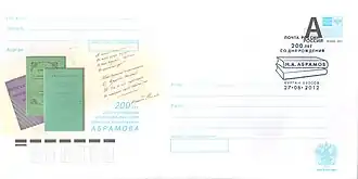 К 200-летию Н. А. Абрамова издательско-торговым центром «Марка» были выпущены художественный конверт и штемпель тиражом 500 000 экземпляров. На конверте изображены его книги и строки из произведений с автографом. В Курганской областной универсальной научной библиотеке имени А. К. Югова состоялось торжественное гашение художественного конверта.