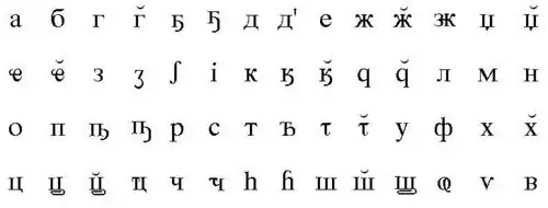 | Ч ч | Ꚓ ꚓ | Һ һ | Ꚕ ꚕ | Ш ш | Ш̆ ш̆ | Ꚗ ꚗ | Ꚗ̆ ꚗ̆ | Ҩ ҩ | Ѵ ѵ |