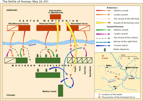 Решающее сражение произошло 26 мая или 2 июня 451-го года на Аварайрском поле. Главнокомандующий армянами Вардан Мамиконян разделил войско на три части, встав сам во главе левого фланга, против которого находились наиболее сильные персидские войска, усиленные элитным корпусом «Бессмертных»[20]. Несмотря на множество недостатков в лице отсутствия помощи и отступничества нескольких дворянских домов и самого важного княжества в Армении, армяне держались до тех пор, пока персы не построили свой слоновий корпус. Они (боевые слоны) сносили армянскую конницу. Однако оборона армян была настолько энергичной, что персы понесли огромные потери. Об ожесточенности сражения можно судить по сообщению Егише, который сравнивал столкнувшиеся войска с тучами, производящими гром, а цветущие поля «оказались залиты обильными потоками крови». После длительного сражения персы окружили армянское войско. Вардан Мамиконян, героически павший во время битвы, стал для армян символом национальной независимости.