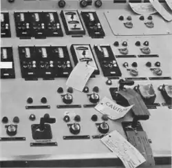 ![]() Президент США Джимми Картер и губернатор штата Пенсильвания Дик Торнберг осматривают панель приборов радиационного контроля в комнате управления АЭС Три-Майл-Айленд. (1 апреля 1979 года) | |