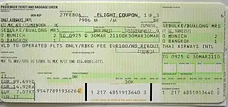 - Каждый полётный купон действовал для перевозки пассажира и его багажа на протяжении указанного в нём участка маршрута. Количество полётных купонов зависит от выбранного маршрута: один — рейс из А в Б; два — рейс из А в Б и обратно или рейс из А в Б через С; больше двух. При регистрации вместо полётного купона выдавался посадочный талон с указанием места в самолёте.