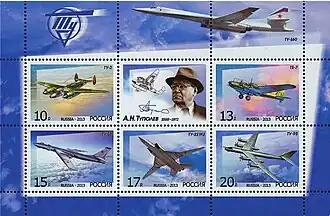 Серия «Бомбардировщики. К 125-летию со дня рождения А. Н. Туполева»: • Пикирующий бомбардировщик Ту-2 • Тяжёлый бомбардировщик ТБ-7 • Дальний бомбардировщик Ту-16 • Дальний бомбардировщик Ту-22M3 • Стратегический бомбардировщик Ту-95 Формат — 42 х 30 Формат марочного листа 150 х 98 мм., 5 марок: • На полях логотип КБ Туполева и бомбардировщик Ту-160 |