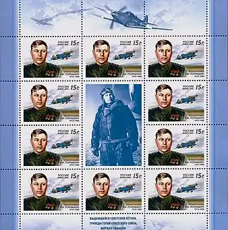 100 лет со дня рождения Б. Ф. Сафонова (1915—1942): • Портрет Б. Ф. Сафонова на фоне самолёта И-16 Марки выпускались в листах по 10 марок и купон |