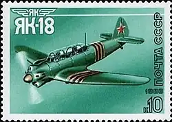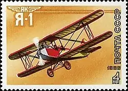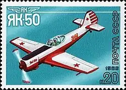 Спортивные самолёты конструктора А. С. Яковлева: • Двухместный самолёт Я-1 (1927 г.) • УТ-2 • Як-18 • Як-50 • Як-55 Марка (Mi #5660); (ЦФА № 5781) выпускалась в малом марочном листе (8 штук) |