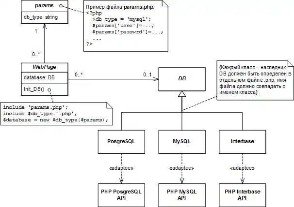 Типичным примером использования шаблона Адаптер можно назвать создание классов, приводящих к единому интерфейсу функции языка PHP обеспечивающие доступ к различным СУБД[3].
