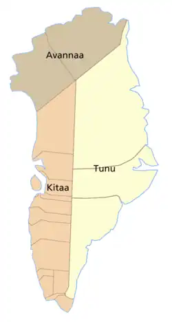 С появлением самоуправления в 1979 году три гренландские территории (amt) были переименованы в Китаа (Западная Гренландия), Туну (Восточная Гренландия) и Аваннаа (Северная Гренландия). Их границы которых проходили практически по прямой по ледовому щиту, граница между Восточной и Западной Гренландией пролегала по 44° западной долготы. Каждая территория имела дополнительное деление на коммуны (муниципалитеты): Китаа состояла из 15, Туну из двух, Аваннаа — одной. Некоторые земли не входили в состав коммун и территорий — Северо-Восточный Гренландский национальный парк, расположенный как в Восточной, так и в Северной Гренландии, а также авиабаза Туле, расположенная рядом с Каанааком.