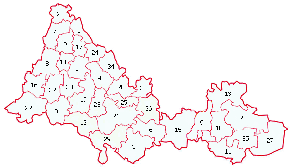 | 1 — Абдулинский район, 2 — Адамовский район, 3 — Акбулакский район, 4 — Александровский район, 5 — Асекеевский район, 6 — Беляевский район, 7 — Бугурусланский район, 8 — Бузулукский район, 9 — Гайский район, 10 — Грачёвский район, 11 — Домбаровский район, 12 — Илекский район, | 13 — Кваркенский район, 14 — Красногвардейский район, 15 — Кувандыкский район, 16 — Курманаевский район, 17 — Матвеевский район, 18 — Новоорский район, 19 — Новосергиевский район, 20 — Октябрьский район, 21 — Оренбургский район, 22 — Первомайский район, 23 — Переволоцкий район, 24 — Пономарёвский район, | 25 — Сакмарский район, 26 — Саракташский район, 27 — Светлинский район, 28 — Северный район, 29 — Соль-Илецкий район, 30 — Сорочинский район, 31 — Ташлинский район, 32 — Тоцкий район, 33 — Тюльганский район, 34 — Шарлыкский район, 35 — Ясненский район, |