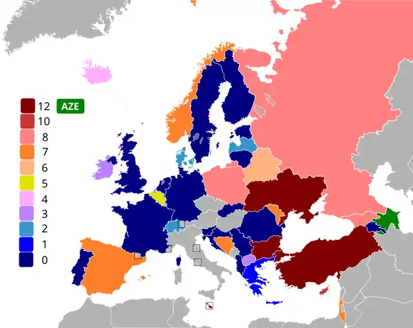 В финале за Азербайджан проголосовало 22 страны, 16 стран не отдали Азербайджану ни одного голоса. Максимальное количество баллов (12) Азербайджану дали Турция Турция, Болгария Болгария, Мальта Мальта и Украина Украина.
