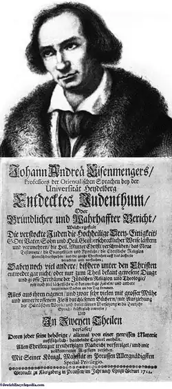 Айзенменгер, писавший до эпохи Просвещения, видел в иудеях всё ещё еретиков в традиционном теологическом смысле; их преступление состояло в их религиозной позиции, их существо определялось разрушительным воздействием их религии.