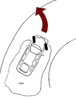 Для предупреждения аквапланирования необходимо не въезжать в лужи на высокой скорости и стараться преодолевать водные препятствия по прямой.