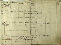 - ↑ Содержание столбцов актовой записи: 1) порядковый номер записи; 2) дата рождения и имя родившегося; 3) наименование населённого пункта, в котором произошло рождение; 4) пол ребёнка; 5) полное имя отца, род его занятий; 6) наименование населённого пункта, в котором проживал отец; 7) возраст отца; 8) особые отметки.