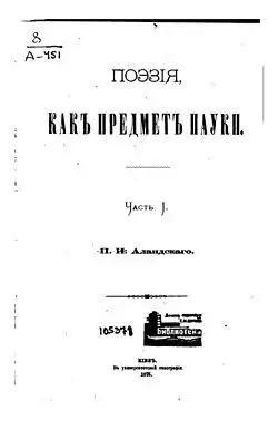 - Поэзия, как предмет науки. — Киев: Унив. тип. И. И. Завадского, 1875. — 199 с.