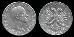 10 леков 27 мм 10 г Надпись Профиль Виктора Эммануила III Албанский двуглавый орёл между двумя фасциями Серебро 0.835