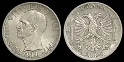 5 леков 23,1 мм 5 г Надпись Профиль Виктора Эммануила III Албанский двуглавый орёл между двумя фасциями Серебро 0.835