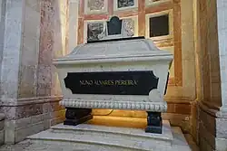 Смерть Нуну, славного героя Португалии, оплакивал король и народ. Его тело захоронили в построенном им монастыре. Долгое время на надгробии светила серебряная лампада, установленная по велению короля Дуарте I[9]. Дочь королей католиков Хуана I Безумная, происходившая из рода коннетабля, велела перенести останки Нуну в богато украшенный саркофаг из мрамора. На нём установили скульптуру из того же камня, использованного согласно обычаю кармелитов. Статуя изображала полководца в его молодые годы в полный рост и в доспехах[9]. Всё это великолепие разрушило лиссабонское землетрясение 1755 года.