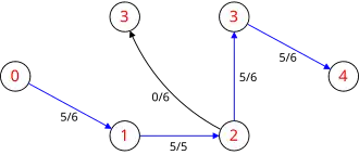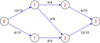 Ниже приведена симуляция алгоритма Диница. Во вспомогательной сети вершины с красными метками — значения . Блокирующий поток помечен синим.