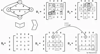 До первой рекурсии внешнего цикла, обозначенного выше k = 0, единственные известные пути соответствуют отдельным ребрам в графе. При k = 1 находятся пути, проходящие через вершину 1: в частности, найден путь [2,1,3], заменяющий путь [2,3], который имеет меньше ребер, но длиннее (с точки зрения веса). При k = 2 находятся пути, проходящие через вершины 1,2. Красные и синие прямоугольники показывают, как путь [4,2,1,3] собирается из двух известных путей [4,2] и [2,1,3], встреченных в предыдущих итерациях, с 2 на пересечении. Путь [4,2,3] не рассматривается, потому что [2,1,3] — это кратчайший путь, встреченный до сих пор от 2 до 3. При k = 3 пути, проходящие через вершины 1,2,3 найдены. Наконец, при k = 4 находятся все кратчайшие пути.