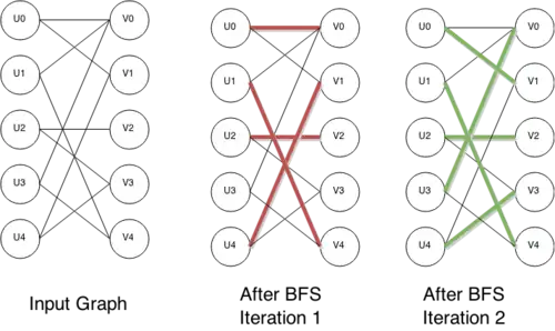 - Поиск в ширину (BFS) разбивает вершины графа на слои. BFS начинает с множества свободных вершин , которые тем самым образуют первый слой разбиения (таким образом, первый слой содержит только не покрытые паросочетанием рёбра). На последующих уровнях поиска алгоритм добавляет вершины на новый уровень, чередуя рёбра: будет попеременно добавлять вершины, связанные ребром то в паросочетании, то вне его, поэтому в процессе поиска из вершины из мы всегда будем проходить по рёбрам не из паросочетания, а если вершина из — то наоборот. Поиск прерывается на уровне , как только впервые будет достигнута хотя бы одна свободная вершина из .