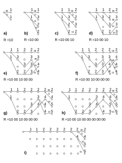 Рассмотрим работу декодера Витерби на простом примере. Полагаем, что кодирование производится с использованием сверточного (7,5)-кода. Пользуясь решетчатой диаграммой кодера, попытаемся, приняв некоторый сегмент , проследить наиболее вероятный путь кодера. При этом для каждого сечения решетчатой диаграммы будем отмечать меру расходимости пути к каждому её узлу. Предположим, что передана кодовая последовательность U = (00000000…), а принятая последовательность имеет вид r = (10001000…), то есть в первом и в третьем кадрах кодового слова возникли ошибки. Как мы уже убедились, процедура и результат декодирования не зависят от передаваемого кодового слова и определяются только ошибкой, содержащейся в принятой последовательности. Поэтому проще всего считать, что передана нулевая последовательность, то есть U = (00000000…). Приняв первую пару символов (10), декодер определяет меру расходимости для первого сечения решетки, приняв следующую пару символов (00), — для второго сечения и т. д. При этом из входящих в каждый узел путей оставляем путь с меньшей расходимостью, поскольку путь с большей на данный момент расходимостью уже не сможет стать в дальнейшем короче. Заметим, что для рассматриваемого примера начиная с четвёртого уровня метрика (или мера расходимости) нулевого пути меньше любой другой метрики. Поскольку ошибок в канале больше не было, ясно, что в конце концов в качестве ответа будет выбран именно этот путь. Из этого примера также видно, что выжившие пути могут достаточно долго отличаться друг от друга. Однако на шестом-седьмом уровне первые семь ребер всех выживших путей совпадут друг с другом. В этот момент согласно алгоритму Витерби и принимается решение о переданных символах, так как все выжившие пути выходят из одной вершины, то есть соответствуют одному информационному символу.