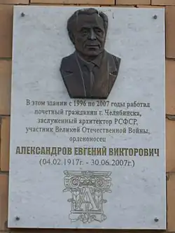- ↑ Скончался старейший зодчий Челябинска Евгений Александров Архивная копия от 26 сентября 2007 на Wayback Machine — РИАНА «Урал-пресс-информ», 30.07.2007