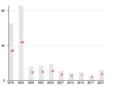 | 1879 | 1905 | 1950 | 1997 | 2007[16] | 2010[17] | 2014[18] |