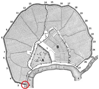 ![]() Алексеевская башня на рисунке из альбома Мейерберга (1661—1662 год). За стеной показаны купола храмов Алексеевского монастыря | |