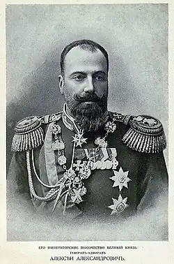 Великий князь Алексе́й Алекса́ндрович (2 [14] января 1850, Санкт-Петербург, Российская империя — 1 [14] ноября 1908 года, Париж, Франция) — четвёртый сын императора Александра II и императрицы Марии Александровны. Член Государственного совета (с 1 января 1881 года), главный начальник флота и Морского ведомства и председатель Адмиралтейств-совета (1881—1905), последний генерал-адмирал Российской империи (с 15 мая 1883 года), адмирал (1 января 1888 года), генерал-адъютант (с 19 февраля 1880 года), почётный член Императорского православного палестинского общества[3]. Тезоименитство[4] — 20 мая (перенесение мощей святителя Алексия Московского).