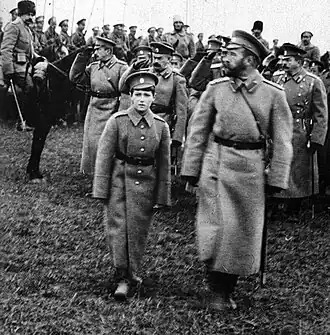 Верховный Главнокомандующий Русской армией Император Николай Александрович и ефрейтор Русской армии Наследник Цесаревич Алексей Николаевич в расположении воинских частей. 1916 год