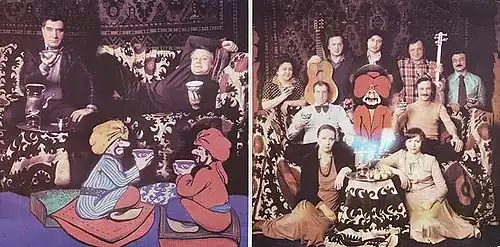 Обложка была создана Валерием Плотниковым (идея), макет создал книжный график Аркадий Троянкер. «Для фотографий долго не могли найти подходящий узорчатый ковёр. Оказалось, что именно такой, персидский, висел в Доме на набережной, в квартире редактора Ирины Якушенко. Сергей Никитин приготовил плов, пили чай из пиал, пели и дурачились. Они остались с пиалами в руках на обложке»[3].