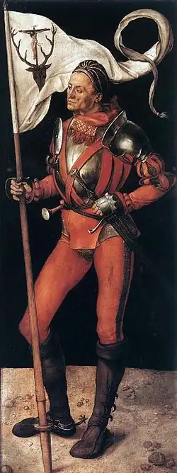 На левой створке изображён Георгий Победоносец с драконом у ног и св. Евстахий со штандартом с изображением оленя. На святых одежда рыцаря и ландскнехта — современников художника. Манускрипт XVII века отмечает, что две эти доски были написаны в 1498 году, и моделями для святых послужили братья Паумгартнеры: Стефан для св. Георгия и Лукас для св. Евстахия. Это самое раннее задокументированное придание чертам небожителя сходства с лицом донатора.