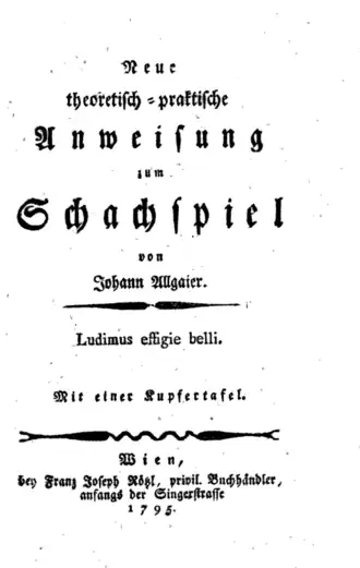 - Линдер И. М. Альгайер (Allgaier) Иоганн // Шахматная энциклопедия / И. М. Линдер, В. И. Линдер. — М. : ООО «Издательство АСТ» : ООО «Издательство Астрель», 2004. — С. 14. — 320 с. — ISBN 5-17-006939-1. — ISBN 5-271-06492-1.