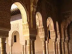 - Львиный дворик (Patio de los Leones). Центральный двор дворца, по периметру окруженный арочными галереями, сходными с галереями Миртового дворика, но по преимуществу со сдвоенными колоннами, общее число которых составляет 124. Входы в апартаменты по преимуществу выделены выступающими портиками. Окружающие дома покрыты остроконечными черепичными крышами. Посредине дворика расположен Фонтан львов (Fuente de los Leones), изображающий двенадцать стилизованных львов, держащих на спинах двенадцатигранную чашу. Долгое время существовала версия, что фигуры львов сделаны ещё в XI в. и происходят из дома визиря Шмуэля ха-Нагида, а поскольку он был иудеем, они якобы символизировали двенадцать колен Израиля. Однако при реставрации фонтана в начале XXI в. выяснилось, что и львы, и чаша сделаны во время строительства дворца, то есть во второй половине XIV в. Чаша также украшена стихами Ибн Замрака.