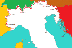 Гористый, бедный дорогами п-ов представляет удобные места для нападения лишь в некоторых пунктах зап. берега; вторжение больших масс неприятеля возможно лишь с С, где большим препятствием для этого служат Альпы, представляющие мало удобных для перехода мест. Со стороны Франции И. защищают трудно проходимые морские Альпы и высокие цепи Коттийских и Грайских Альп, до Монблана. Все проходы защищены рядом фортов, мелкие укрепления расположены вдоль подножия Альп, а далее лежат крепости Генуя, Алессандрия, Казале, Пьяченца, Павия, Пицциггеттоне, Кремона. Со стороны Швейцарии укрепления построены для защиты Шплюгенского и Симплонского проходов. Со стороны Австрии множество укреплений, фортов и батарей защищает все проходы; сильно укреплен также промежуток между р. Изонцо и Эч. На месте соединения долины Эч и Фриуля лежит знаменитый четырехугольник крепостей: Верона, Пескиера, Леньяно и Мантуя.