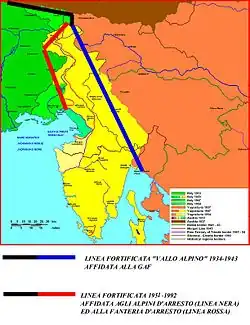 Строительство Альпийского вала всерьёз началось в 1931 году, и было предназначено для прикрытия дугообразной итальянской границы от Средиземного побережья на западе до города Фиуме на Адриатическом побережье на востоке. Эшелонированная оборона разделялась на три зоны по расстоянию от границы: