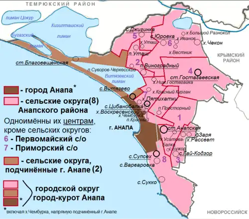 В рамках муниципального устройства края помимо территории Анапского района к единому муниципальному образованию город-курорт Анапа относится город Анапа с подчинёнными ему 2 сельскими округами (Благовещенским и Витязевским), при этом 1 хутор (Чембурка) находится в прямом подчинении администрации города Анапы.