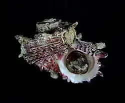 Раковина среднего размера, около 40—80 мм, высоко-дисководная, толстостенная. Завиток плоский, его последний оборот крупный, с угловатым плечом. Наружная поверхность раковины не ровная и покрыта многочисленными спиральными рёбрами и бугорками. Вдоль плечевого выступа идёт ряд крупных бугорков либо рожковидных выростов. Один ряд более мелких бугорков треугольной формы проходит несколько ниже середины последнего оборота раковины. Основание раковины моллюска округлой формы, с крупным пупком. Устье раковины округло-квадратное, с ярким перламутром. Внутренняя губа обрамлена лилового цвета складкой. Окраска раковины варьируется от розоватой и зеленоватой до вишнёво-коричневой, с чёрными пятнами.