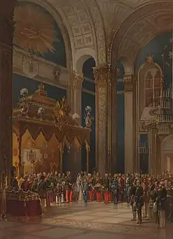 Зал использовался для торжественных мероприятий, в его стенах проходили коронации Александра II, Александра III и Николая II[5]. Изначально центром помещения являлся трон действующего монарха, украшенный резьбой и драгоценными камнями. В конце XIX века на постаменте расположили три сидения вместо одного: для императора Николая II, императриц Александры Фёдоровны и Марии Фёдоровны. Во время церемоний, проходивших в этих палатах, только они имели право сидеть[6][7][3].