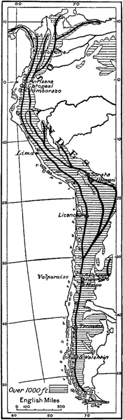 Анды состоят преимущественно из меридиональных параллельных хребтов: Восточные Кордильеры Анд, Центральные Кордильеры Анд, Западные Кордильеры Анд, Береговые Кордильеры Анд, между которыми лежат внутренние плоскогорья и плато (Пуна, Альтиплано — в Боливии и Перу) или впадины[6]. Ширина горной системы составляет в основном 200—300 км.