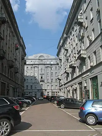 Несмотря на сложную планировку, архитекторам удалось создать согласованный архитектурный ансамбль шестиэтажных зданий, монументальные формы которых подчеркиваются внушительным декором в стиле неоклассицизма[1]. Открывающиеся благодаря широкому внутриквартальному проезду перспективы усиливают масштабность архитектурного ансамбля.