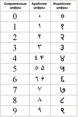 | Индо-арабские цифры, используемые в арабских странах Азии и в Египте | ٠ | ١ | ٢ | ٣ | ٤ | ٥ | ٦ | ٧ | ٨ | ٩ |