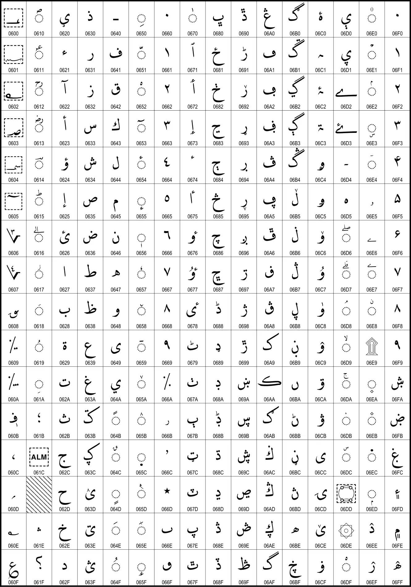 | L2/03-210 | Kew, Jonathan (12 июня 2003), Draft chart showing UTC #95 additions to Arabic blocks | |||||
