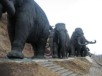 В 2007 году на подпорной насыпи была установлена первая скульптурная группа из семи фигур мамонтов. Открытие «Археопарка» состоялось осенью 2008 года. К концу 2009 года были установлены следующие скульптуры и скульптурные группы: «Мамонты» (группа из 11 животных), «Волчья стая» (группа из 4 животных), «Стоянка первобытного человека» (группа из 8 фигур и жилище), «Первобытные бизоны» (группа из 4 животных), «Шерстистые носороги» (2 фигуры), «Пещерные медведи» (группа из 3 животных), «Пещерный лев» и «Большерогий олень». Фигуры различных животных масштабированы в разных пропорциях — от сделанных в натуральную величину (носороги) до увеличенных в 2-3 раза (например, бизоны). Высота наибольшей скульптуры мамонта 8 м.