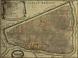 В XVIII веке улицы Иркутска оставались «косы и кривы». В 1760-е годы первым иркутским губернатором К. Л. Фрауендорфом принимаются меры «к благоустройству города»[4]. Первый регулярный план развития города был разработан неизвестным автором в 1791 году и утверждён Екатериной II 4 августа 1792 года. Реализация плана началась лишь в 1810-е годы[5]. К этому времени относится введение предварительного согласования всех проектов построек с архитектором города. С улицы Морской с места острога открывался путь на Байкал. Улица Першпективная, образованная на месте городской укрепительной стены, выходила на Якутский тракт. Улица Московская вела к переправе через Ангару, откуда начинался Сибирский тракт. Кругоморская дорога с левого берега Ангары вела в Забайкалье[6]. Во 2-й половине XIX века появляются многоквартирные деревянные дома[7]. В 1891 году был разобран Гостиный двор, построенный в конце XVIII века по типовому палладианскому проекту. В 1930-е годы прекратил существование Интендантский сад. Здание городской думы, перестроенное в 1895 году, в советское время полностью утратило свой первоначальный вид вместе с декором фасада[8].