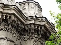 В конце XIX века в Киеве из-за роста цен доходные дома строились с привлечением денежных средств Киевского городского кредитного общества. Иногда большие доходные доме строились в складчину. В конце ХІХ — начале XX века весь центр Киева был застроен доходными домами. Наиболее известные доходные дома — «Дом с химерами», дома по улице Городецкого (архитекторы Г. Шлейфер, Э. Брадтман, В. Городецкий)[20], Дом с котами (архитектор Владимир Бессмертный), дом Морозова на улице Льва Толстого[21], дом Гинзбурга. Дом Гинзбурга был построен в 1900—1901 году. Фасад здания украшали многочисленные скульптуры античной тематики. Здание имело 21 балкон. В начале XX века это был самый высокий дом Киева (32,5 м), на его крыше было 5 деревянных башен. В доме была устроена парадная мраморная лестница с витой оградой и дубовыми перилами, стены были покрывала художественная роспись и лепнина.