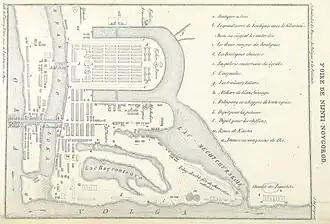 В 1824 году утверждена новая планировка Нижнего Новгорода по проекту архитектора В. И. Гесте. Он закрепил результаты перепланировки по проекту 1770 года, а также гигантский ярмарочный комплекс, выстроенный по проекту архитектора О. Монферрана под руководством инженера А. А. Бетанкура в 1822 году. На этом плане город впервые рассматривался с ярмарочным ансамблем и Кунавинской слободой, ставшей частью города и получившей регулярную планировку. Началось активное освоение левобережной зоны Оки. 20 — 30-е годы XIX века в архитектуре Нижнего Новгорода связаны с творчеством нижегородских архитекторов А. Л. Леера, И. Е. Ефимова и петербургского архитектора А. И. Мельникова[21].