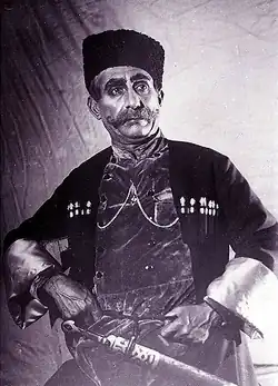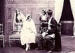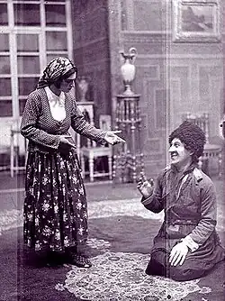 Участники спектакля «Аршин мал алан» в Ашхабадском азербайджанском театре в 1917 году (справа налево): Телли (Яхья Исмаилов), Вели (Мирза Самедов), тётя Джахан (Аслан Гаджиев), Султан-бек (Азиз Джавадов), Аскер (Али Мамедов), Гюльчохра (Агагулу Абдуллаев), Сулейман (Рзагулу Абдуллазаде), Асья (Рагим Рагимов)[56]