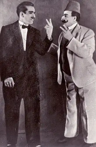Сцена из постановки «Аршин мал алан» в Уфе. 1939 год. Хабир Галимов в роли Аскера и Габдрахман Хабибуллин в роли Султанбека