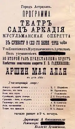 8 июня 1918 года труппа «бакинских мусульманских актёров» с участием Аббаса Мирзы Шарифзаде, Александры Оленской, Джалила Багдадбекова, поставила в астраханском летнем саду «Аркадия» оперетту «Аршин мал алан». Комедия была сыграна также 30 мая (12 июня) 1918 года в Зимнем театре города Астрахань[35]. Поставил оперетту Аббас Мирза Шарифзаде. Он же сыграл роль Султанбека[36]. Это была первая игра Шарифзаде в этой комедии[37].
